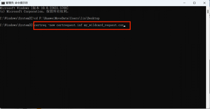 3、在命令提示符中,输入“certreq -new certrequest.inf my_wildcard_request.csr”命令,随后点击回车。