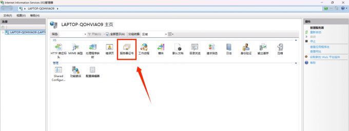 1、按下win+R,输入“inetmgr”,打开IIS服务器,在服务器界面中选择“服务器证书”选项,进入证书管理界面。
