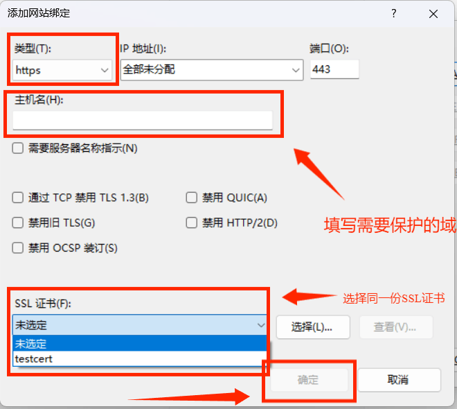 4、在网站绑定界面中,将“类型”选择为“https”;将“主机名”填写需要保护的主机名;在下方的“SSL证书”一栏中选择CA机构给我们颁发的证书,随后点击“确定”即可。